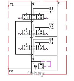 Position de travail 2 (levier vers le haut), la tige de piston du cylindre hydraulique se rétracte. Alimentation de la pompe (P) : filetage femelle BSP 1/2. Sortie pour sections (A, B). Plage de pression Pression d'alimentation maximum : 250 bar.