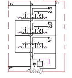 Position de travail 1 (levier vers le haut), la tige du piston du cylindre hydraulique sort. Position de travail 2 (levier vers le haut), la tige du piston du cylindre hydraulique se rétracte. Retour au réservoir (T) : filetage femelle BSPP 3/4. Sortie pour section (A, B) : filetage femelle BSPP 1/2. Connexion en série (N) : filetage femelle BSPP 3/4. Plage de pression Pression d'alimentation maximale : 250 bar. Pression de retour maximale : 50 bar.Pression maximale dans les sections : 300 bar. Soupape de dérivation (sécurité) réglée en usine à 175 bar. Auto-régulée, déplacement de pleine rotation de 30 bar. Température ambiante admissible : de -40 °C à + 60 °C.