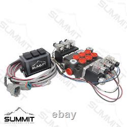 Port de sortie : #10 SAE O-Ring (7/8-14) filetage. Tolérance de tension nominale +/- 10%. Boîtier de commutation avec trois interrupteurs à bascule momentanés qui reviennent automatiquement à la position neutre. Harnais d'extension de 7,5 pieds de long. Enveloppe étanche et connecteurs DIN.
