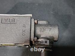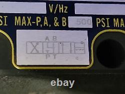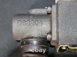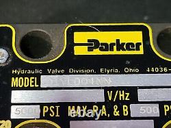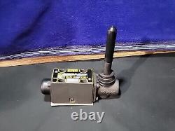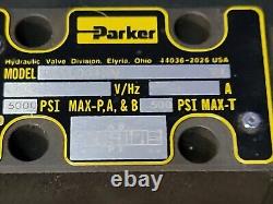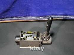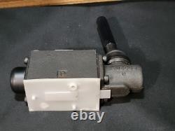 Ceci est une vanne hydraulique Parker DV1LOO4NN 91 à 3 positions. Elle a une pression maximale de 5000 PSI P. & B, et 500 PSI Max-T. Elle mesure 5-3/4" de long, 5-3/4" de haut avec la poignée et fait un peu plus de 1-3/4 de large.
